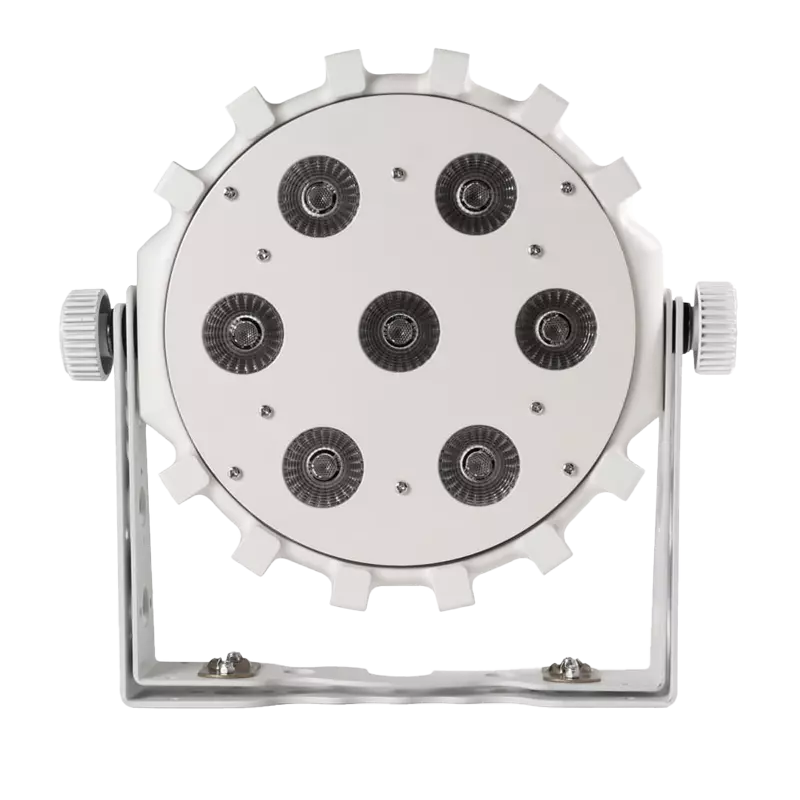 Biały Reflektor LED PAR Slim z siedmioma diodami o łącznej mocy 70W teraz w wersji z bezprzewodowym interfejsem DMX, oraz kącie świecenia 25°. Brak konieczności łączenia reflektorów przewodami z sygnałem sterującym otwiera przed użytkownikiem niezliczone możliwości wykorzystania tego urządzenia w miejscach, gdzie instalacja oświetlenia jest znacznie utrudniona lub wymaga szybkiego tempa pracy. Tam, gdzie warunki uniemożliwiają prowadzenie kabli, bezprzewodowy interfejs DMX pozwala na utrzymanie łączności i wykorzystanie pełnego spektrum możliwości reflektora dostępnego jedynie podczas sterowania przez DMX.